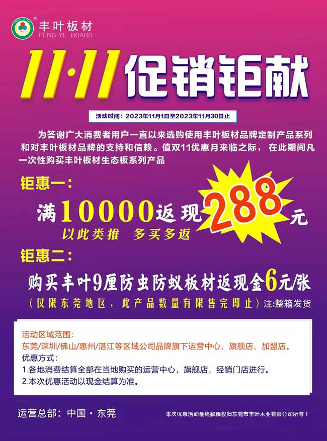 1、雙11優(yōu)惠月之際,凡一次性購買楓葉板生態(tài)板系列產(chǎn)品滿10000元即可獲現(xiàn)金返利288元,依此類推,買得越多送得越多。