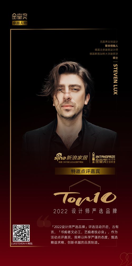 近日,由新浪家居聯(lián)合金堂獎(jiǎng)全國(guó)聯(lián)盟共同發(fā)起的「2022 設(shè)計(jì)師嚴(yán)選品牌 TOP10」活動(dòng),匯集了全國(guó)兩岸三地的設(shè)計(jì)大咖擔(dān)任特邀點(diǎn)評(píng)嘉賓,并邀請(qǐng)全國(guó)千余名卓越青年設(shè)計(jì)師擔(dān)任推薦官,將以設(shè)計(jì)師專業(yè)視角,甄選中國(guó)家居品質(zhì)制造。 活動(dòng)匯集國(guó)內(nèi)設(shè)計(jì)中堅(jiān)力量,范圍覆蓋百余城萬(wàn)余設(shè)計(jì)師,同時(shí)32位大咖參與點(diǎn)評(píng)。以最強(qiáng)設(shè)計(jì)師陣容,甄選出服務(wù)于設(shè)計(jì)師及業(yè)主的高品質(zhì)制造品牌。STEVEN LUX擔(dān)任「2022 設(shè)計(jì)師嚴(yán)選品牌TOP 10」特邀點(diǎn)評(píng)嘉賓。