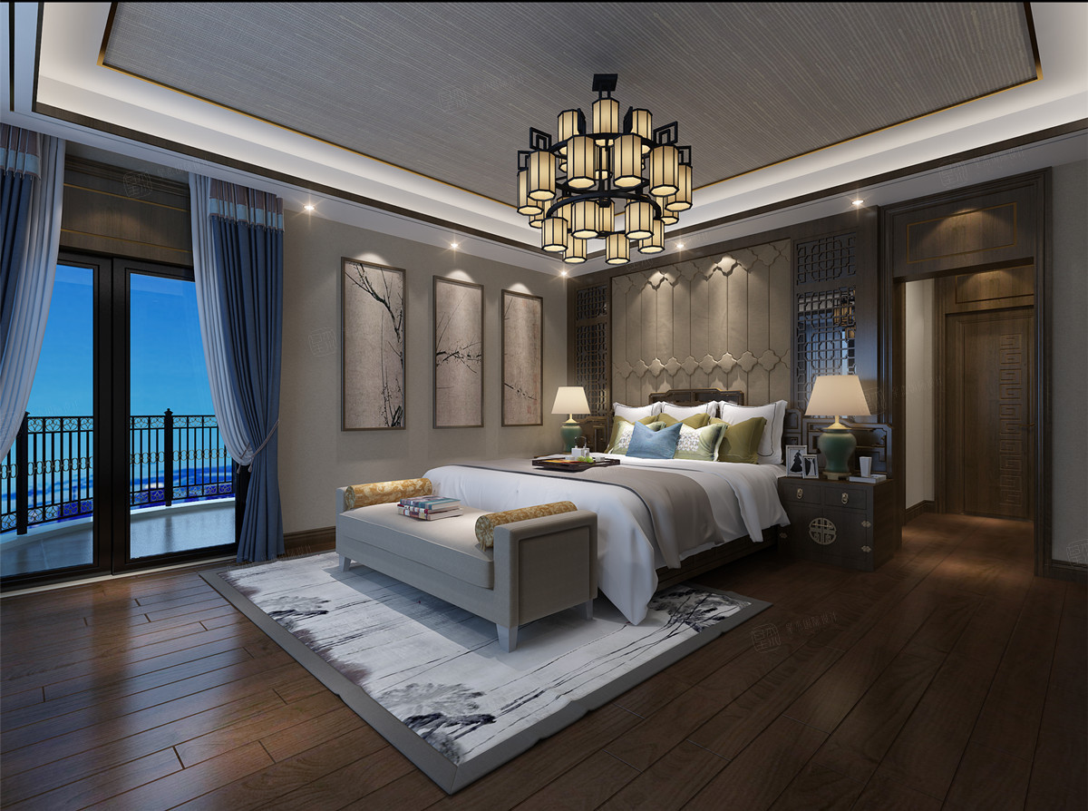 主臥室比較大,做成了套房。 功能齊全,居住舒適,空間更加開闊。 主臥室設有飄窗柜,美觀又實用。 主臥室位于三樓。 三樓的層高也有三米多廈門新中式裝修風格,所以主臥室的整體立體效果還是很好的。